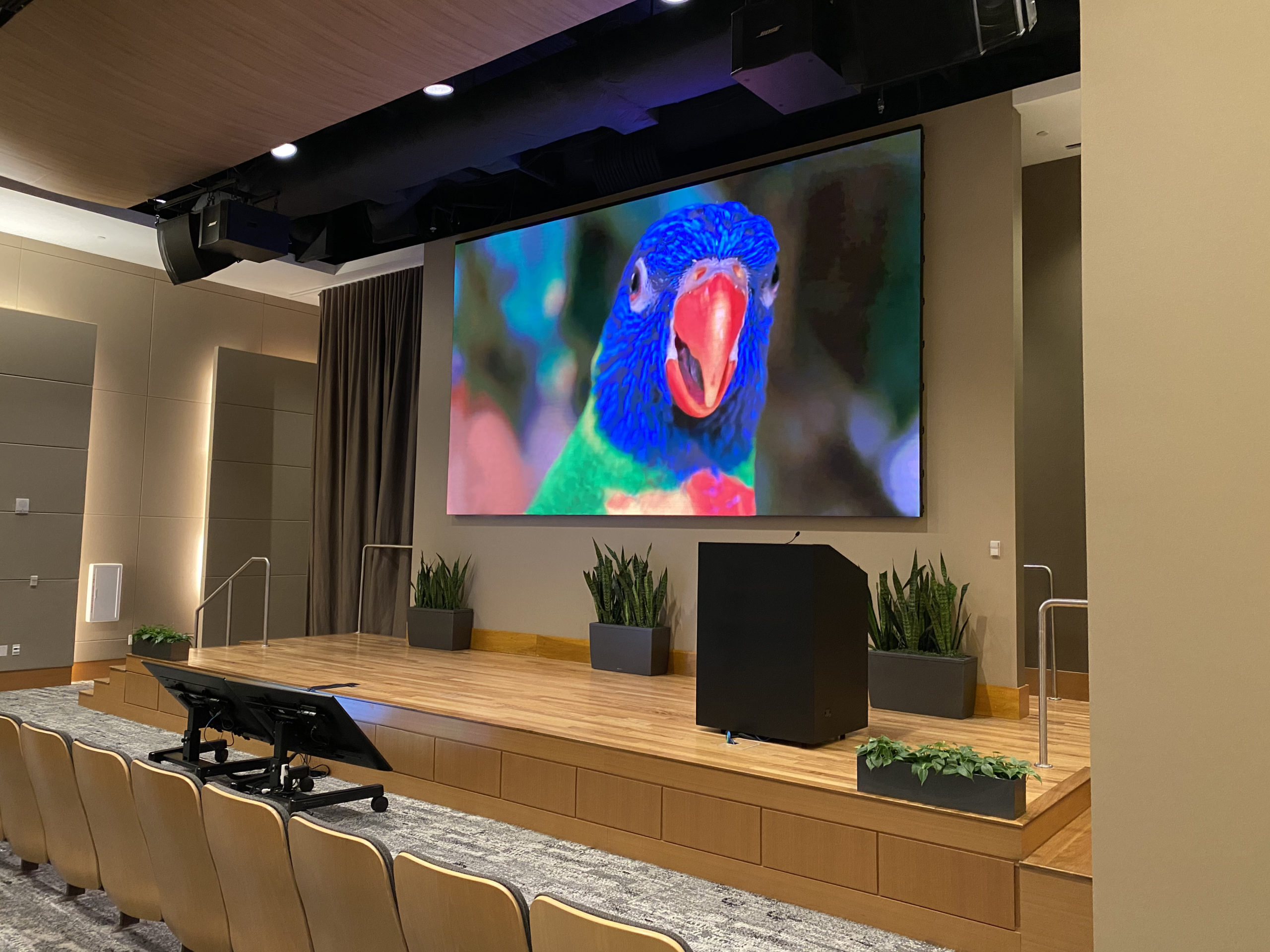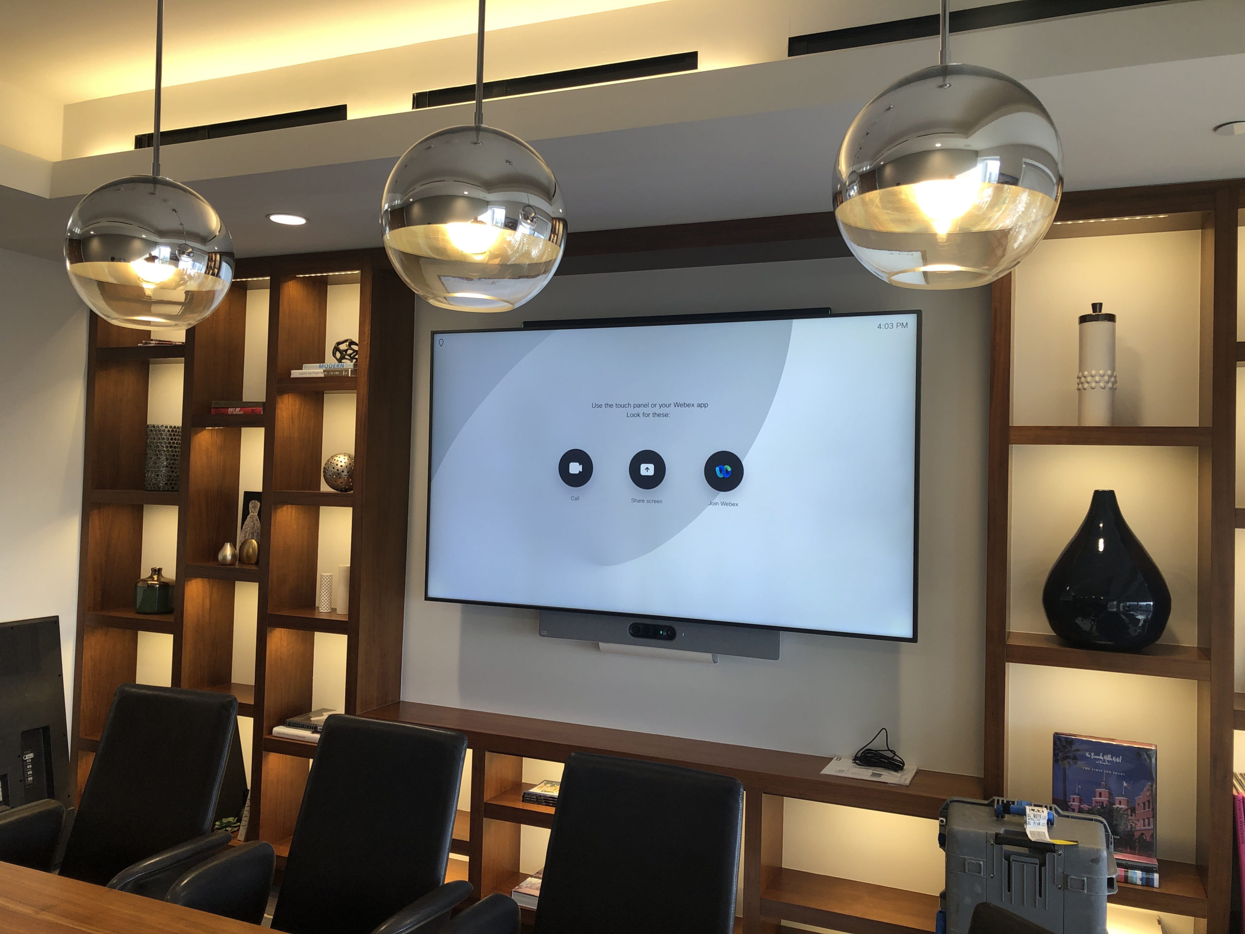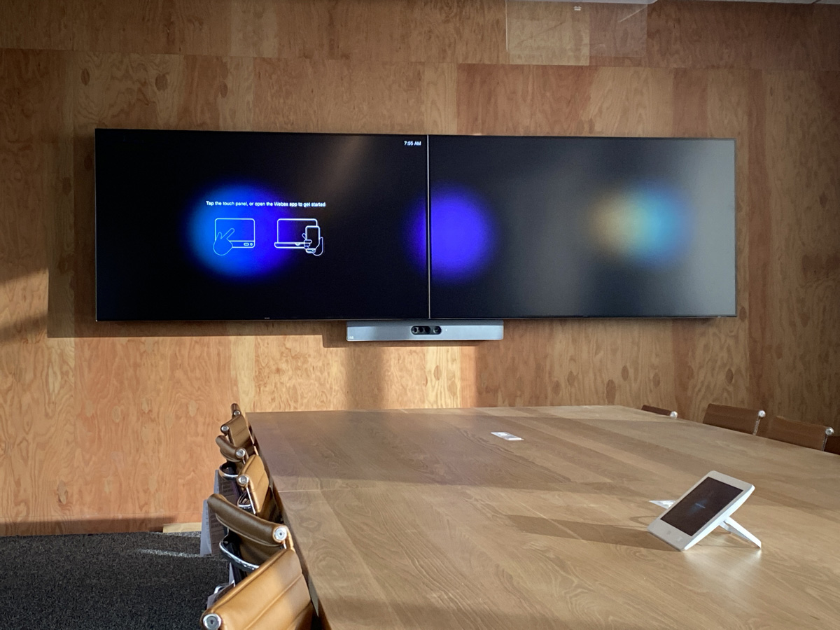 A Boardroom featuring a 98″ Display, and two Cisco Quad Cameras positioned at angle on custom millwork to eliminate any gaps in the video pick up. The space features three primary zones of speakers and a fourth zone for overflow so that users can hear clearly, while additional ceiling microphones ensure clear audio pick up so remote attendees aren’t missing anything.