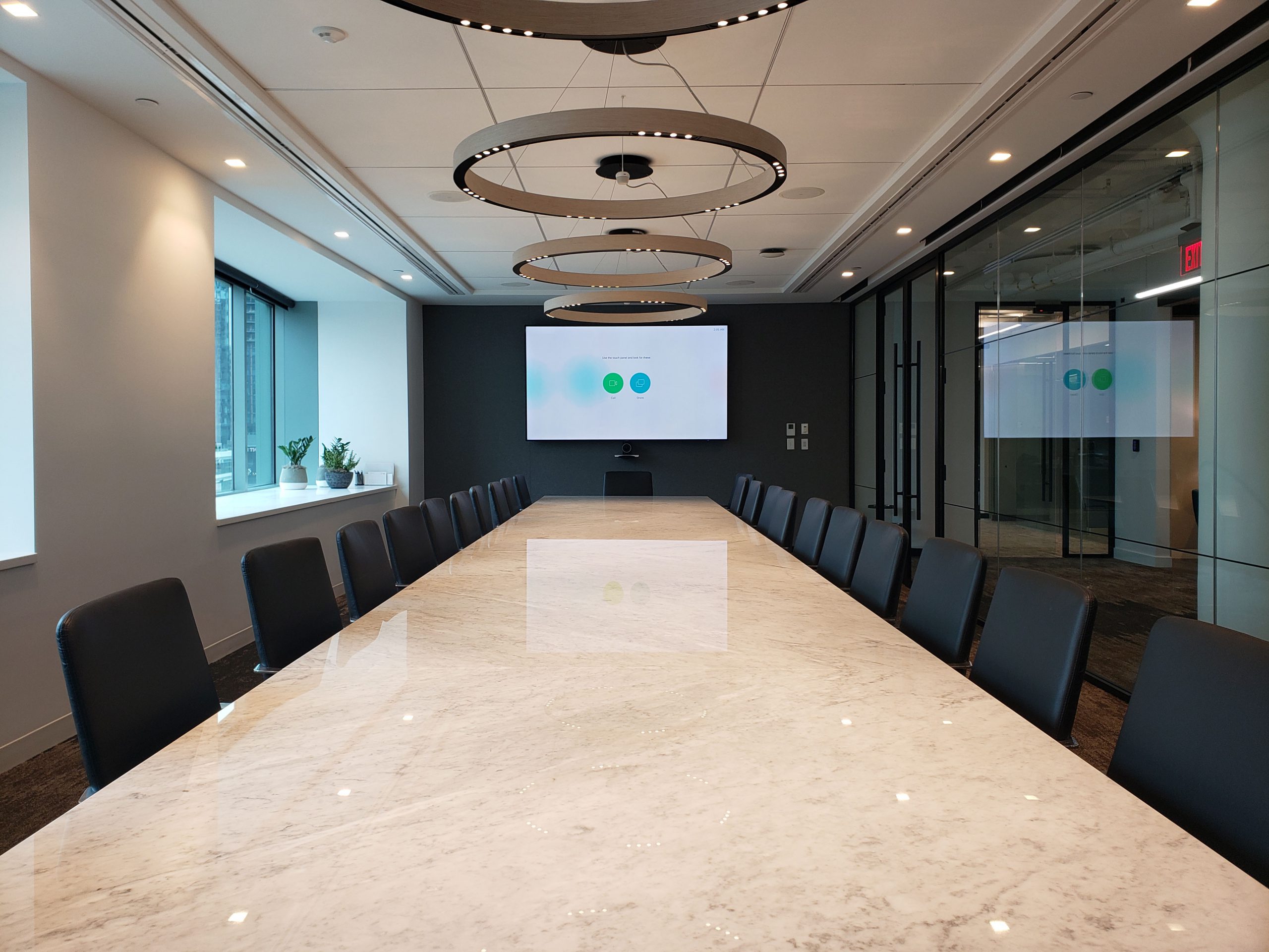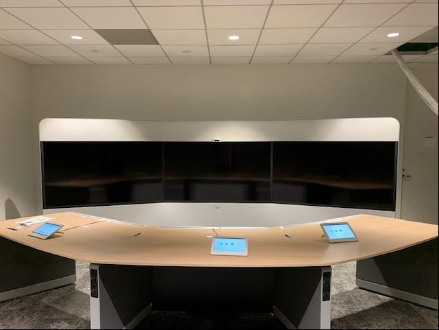 A Boardroom featuring a 98″ Display, and two Cisco Quad Cameras positioned at angle on custom millwork to eliminate any gaps in the video pick up. The space features three primary zones of speakers and a fourth zone for overflow so that users can hear clearly, while additional ceiling microphones ensure clear audio pick up so remote attendees aren’t missing anything.
