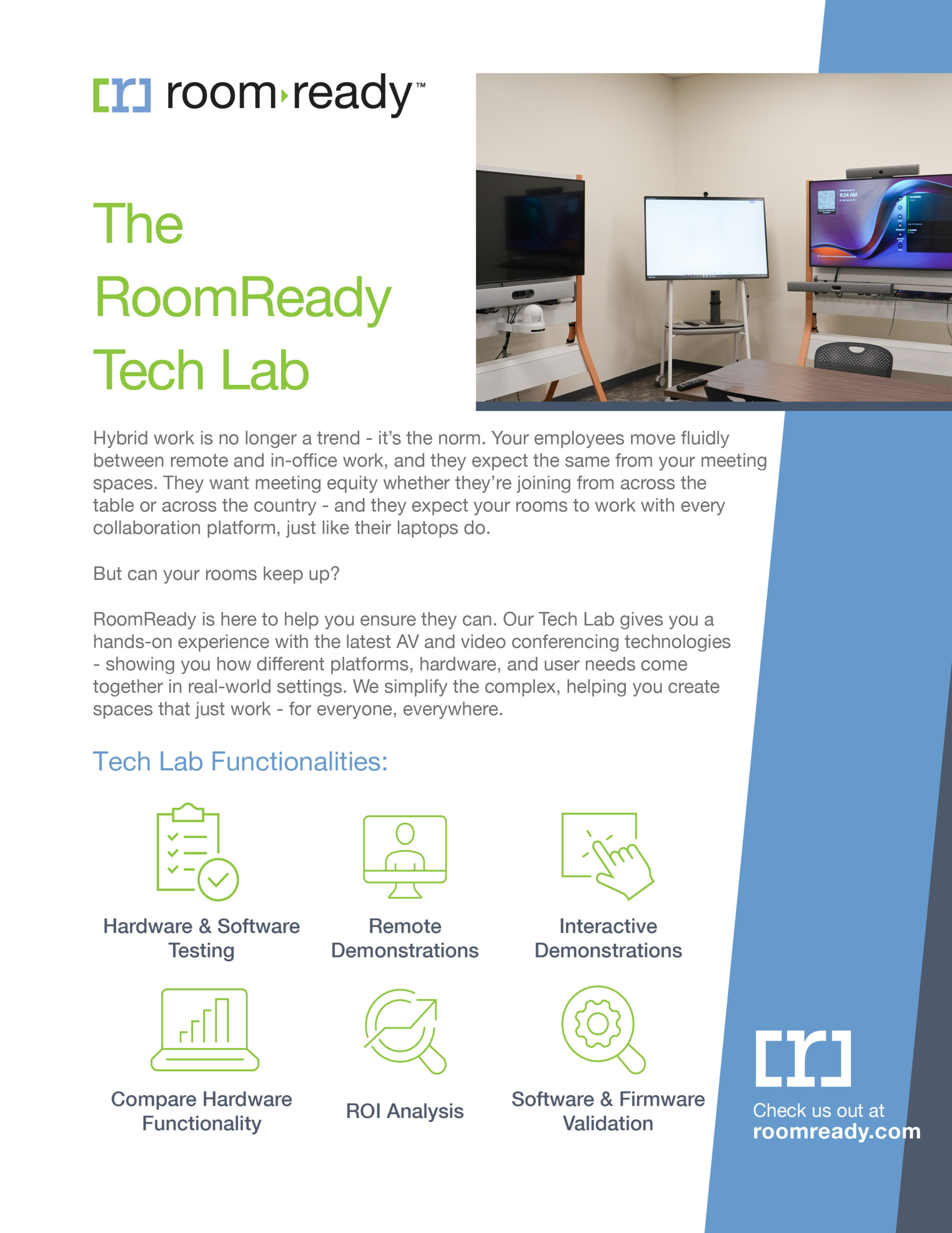 Meeting rooms and end-user needs are constantly evolving—and AV technology must evolve with them. That’s why we created the RoomReady Tech Lab. This dedicated space allows us to test, train, and fine-tune AV solutions before they ever reach a customer site. From hands-on demos and side-by-side hardware comparisons to software and firmware testing, the Tech Lab ensures every solution is optimized for performance, compatibility, and long-term value.